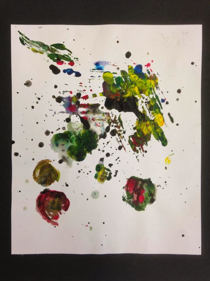 I dette bildet har jeg også lyse og mørke farger, denne kontrasten er som sagt med på å skape dybde og fremheve former. Igjen er formene organisk, hvor jeg også her har valgt å bruke prikker som et virkemiddel. Her har jeg brukt elementtrykk, hvor jeg har brukt papir for å skape de største prikkene. Bildet er organisk. Det ser ut til at retningen går fra høyre hjørne, til det venstre hjørnet nede i bildet. Komposisjon kan se ut til å være en krysskomposisjon som er med på å understreke konflikter. Bildet er veldig eksplosivt, noe som passer godt til tittelen.